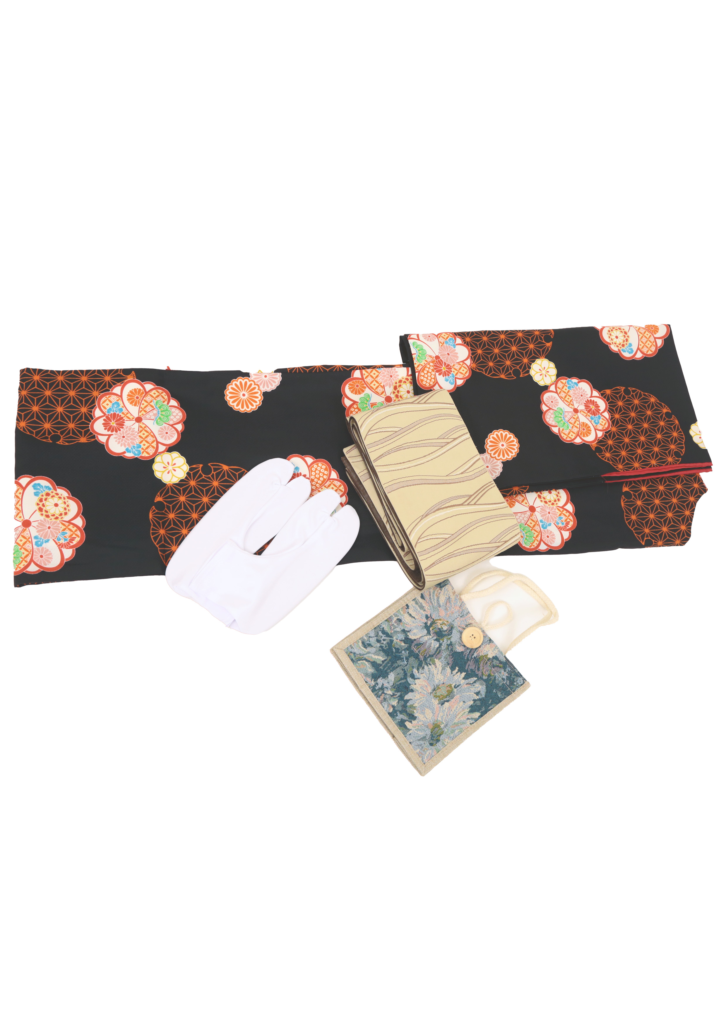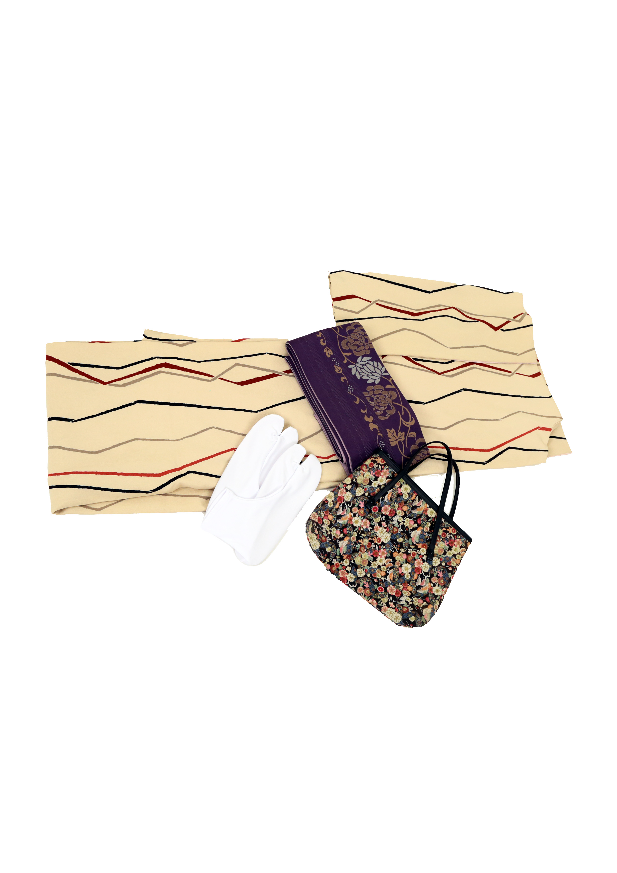 A plan that includes a kimono, obi belt, bag, tabi socks, and sandals together as a set.